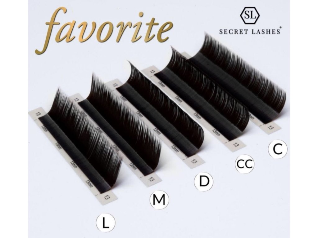 Řada řas Favorite je vyrobena z nejkvalitnějšího hypoalergenního PBT vlákna. Vlákna jsou elastické, hustě tkané a velmi jemné, díky čemuž se vějíře tvoří s výjimečnou lehkostí a rychlostí. Řasy jsou umístěny na 2mm lepícím proužku, díky kterému snadno vytvoříte vějíře jakoukoliv technikou.