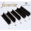 Řada řas Favorite je vyrobena z nejkvalitnějšího hypoalergenního PBT vlákna. Vlákna jsou elastické, hustě tkané a velmi jemné, díky čemuž se vějíře tvoří s výjimečnou lehkostí a rychlostí. Řasy jsou umístěny na 2mm lepícím proužku, díky kterému snadno vytvoříte vějíře jakoukoliv technikou.
